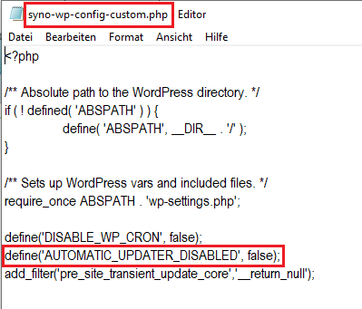 WordPress auf Synology erfordert etwas speziellere Behandlung. Updates sind hier von Haus aus deaktiviert. Um die automatischen Updates zu nutzen benötigen wir 2 Schritte. Als Erstes müssen wir die „syno-wp-config-custom.php“ im WordPress Ordner bearbeiten. Hier müssen wir die automatischen Updates auf „false“ stellen.
